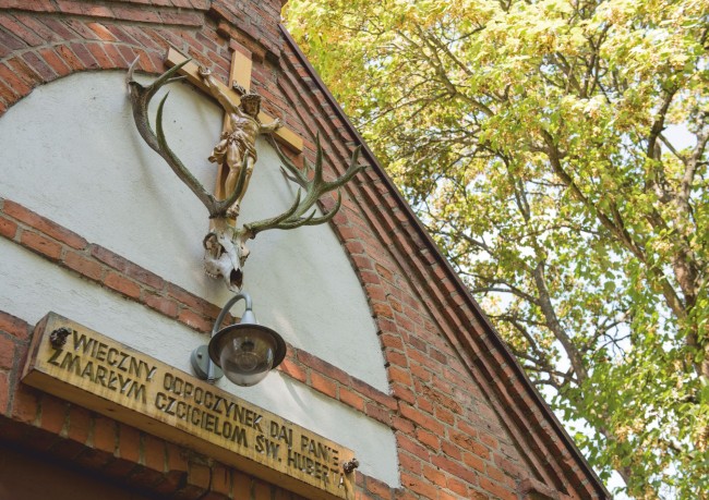 Über die Einzigartigkeit dieses Gebäudes entscheidet seine ungewöhnliche Innenausstattung mit Jagdmotiven. Der Altar ist aus einem nicht entrindeten Eichenast gebaut. Die Kanzel wurde mit Hirschhörnern verziert. Die Beleuchtung des Gotteshauses ist auf Reh- und Hirschgeweihen montiert, und zwei Mosaikfenster zeigen die Schutzheiligen der Wälder und Jäger: Rochus und Hubertus.